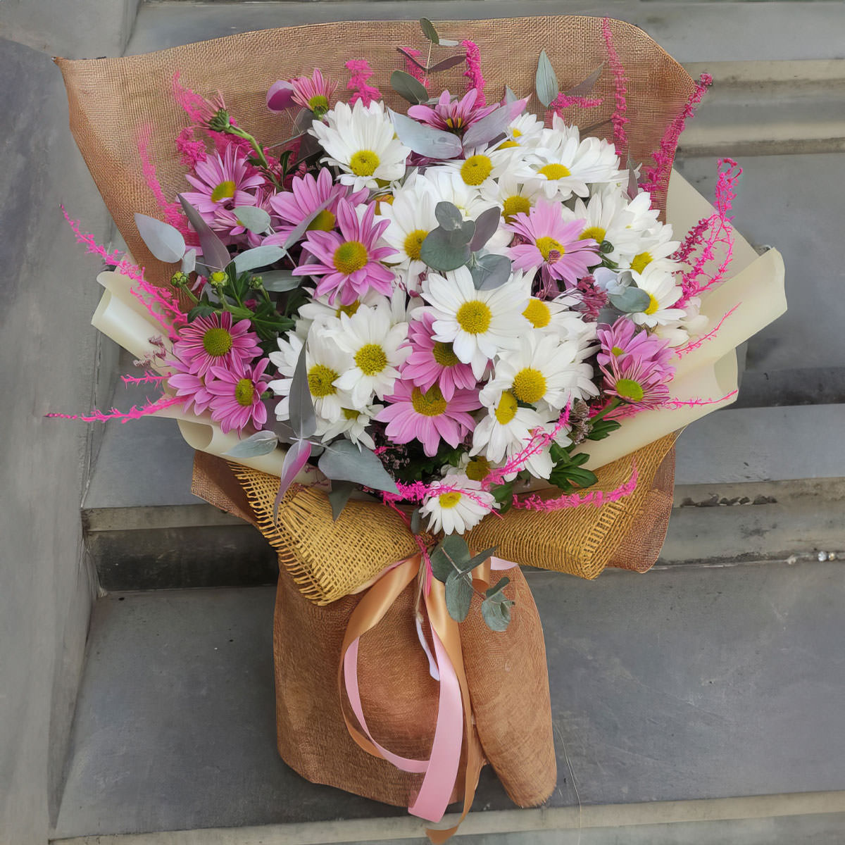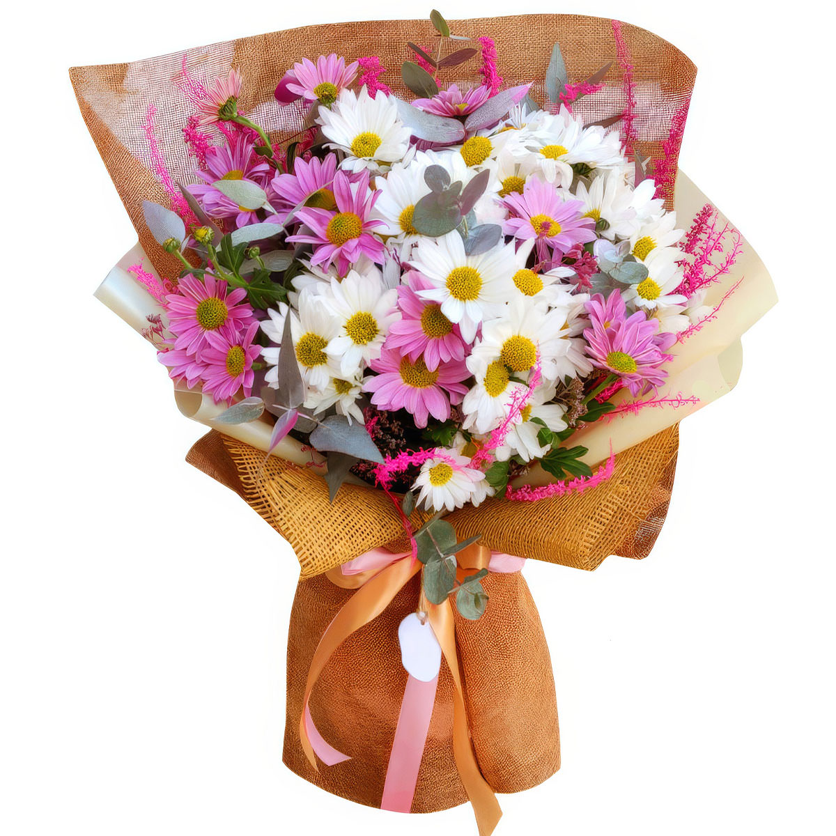 Яркие белые и розовые оттенки хризантем, дополненные эвкалиптом и сухоцветами, создают атмосферу лёгкости и радости. Букет оформлен в крафт-бумагу и сетку, перевязанную атласной лентой персикового цвета. Композиция придаёт свежесть и оживление любому пространству. Отличный выбор на благодарность врачу для создания теплой и искренней атмосферы.